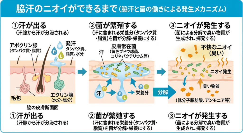 まず誤解されがちですが、腋臭の原因は単純な汗ではありません。